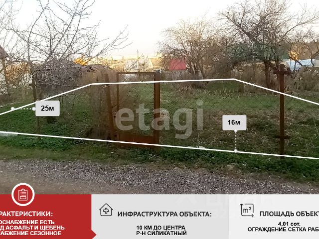 Продается участок в СНТ Солнечное за мкр-м Силикатный. С участка отрывается красивый вид на город и сосновый лес. Участок расположен на возвышенности, имеет небольшой уклон, как и вся территория СНТ. ХАРАКТЕРИСТИКИ: - участок 4,01 сотки, ровной квадратной формы - обрабатывается - на территории строение для хоз.инвентаря (не для проживания) - ограждение сетка-рабица - подъезд к участку асфальт, щебень - зимой дороги чистятся - столб возле участка - вода сезонная - межевание сделано Лесополоса в 200м от участка. Подъезд с двух сторон: от д.Белая и по ул.Гурьянова. Магазин, Храм в 20 минутах пешим ходом. Почему нужно работать с Федеральной компанией "Этажи"? - Юридическое сопровождение сделки и гарантия финансовой защиты - Уникальные условия на услуги страхования объекта - Самые низкие ипотечные ставки - Новостройка без комиссии - Программа лояльности "Этажи Бонус" для клиентов компании "Этажи" от партнеров . Код пользователя: 91950 Номер в базе: 3092933