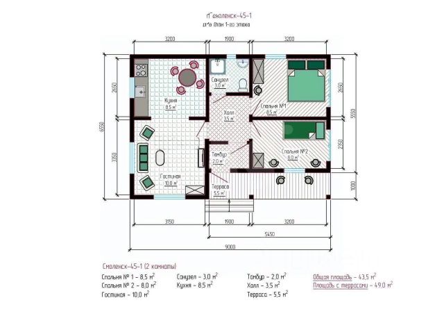 • Площадь дома 45 м2, внутри 33 м2 + веранда 12 м2.