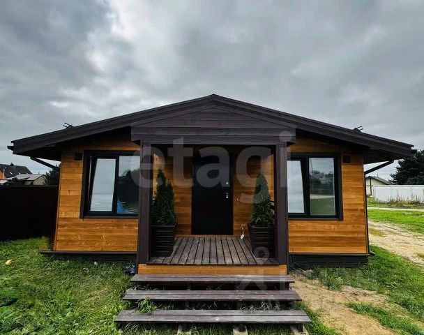 Дом 100 квадратов, два этажа. Первый этаж — брус 190, обшит имитацией бруса, выглядит как настоящий деревянный дом. Второй этаж — каркасный, тёплый и лёгкий. Отопление — электрическое, газ до границы участка — можно подключить, если захочется.
