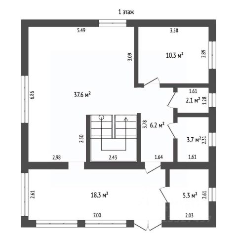 Первый этаж: высота потолков 2,75м, тамбур, прихожая, санузел, гостиная с камином (38м2), жилая комната (17м2), кухня-столовая (20,5м2) . Материал: пенобетонные блоки, кирпич, сайдинг, утеплён с двух сторон. Окна ПВХ. Перекрытие: железобетонные плиты.