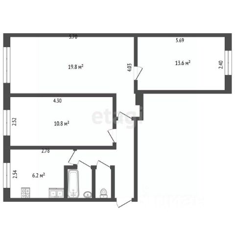 Общая площадь квартиры составляет 60 кв м (55,4 кв м по техническому паспорту с учетом понижающего коэффициента по двум лоджиям), из них: