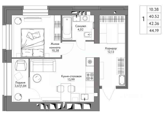 В продаже большая однокомнатная квартира с лоджией в ЖК Острова секция БС-2.