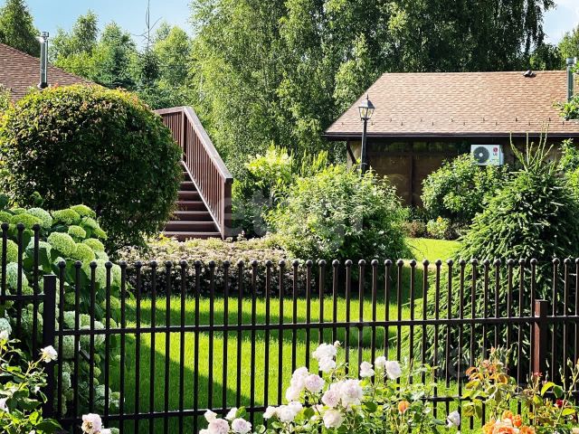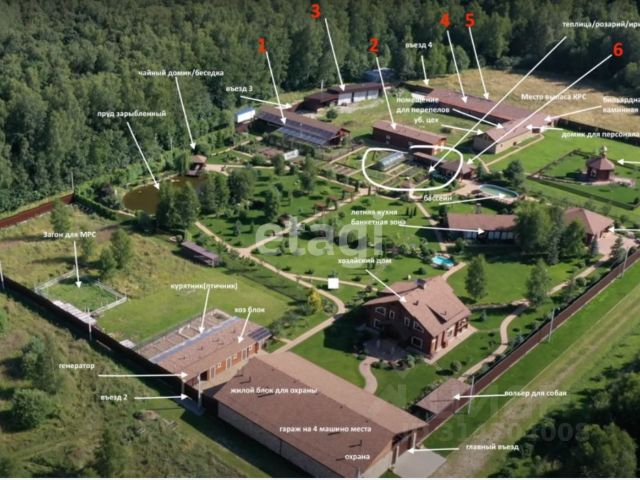 На первом уровне: Жилой 2-х этажный дом 262 кв.м. из оцилиндрованного бревна. 1-й этаж: терраса, прихожая, гардеробная 18 кв.м., каминный зал 36 кв. м., кухня-столовая 54 кв. м. с русской печкой, подвал, 2-й этаж: холл 20 кв.м., кабинет 14 кв.м., санузел, две спальни 24 и 16 кв.м, балкон 15 кв.м. Два раздельных санузла, две ванны, одна с финской парилкой - сауна. На кухне и в коридоре теплый пол. Инфраструктура дома автономная - индивидуальное водоснабжение (скважина колодец) с закольцованной системой подачи воды. Отопление: электрический немецкий котел в доме и немецкий котёл на твердом топливе в отдельном помещении. Канализация септик, расположен отдалённо от жилых строений с удобным подъездом с учётом рельефа местности, обеспечивающим 100% дренаж. Электроснабжение 380 В , дополнительно установлен немецкий аварийный дизельный генератор 24 кВт.