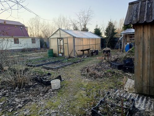 Дом с земельным участком. С кровлей металлочерепица, не пользуюсь более 7 лет. Приезжаю, ухаживаю по возможности по участку. Удачное расположение дома. С восточной стороны огромный пролёт, нет соседей, с западной стороны последний крайний дом соседский, вокруг просторы, тихое место с идеальным воздухом, рядом в низине бобриные угодья, раньше там ловили раков, сейчас нет, но может заведутся еще). В 20-ти минутном пешем расстоянии есть станция, однопутная ЖД с поездом регулярным, состоящий из 2-х вагонов, как в европе. Электричество там есть. Дом временно обесточен, провода отсоединены от счётчика и щитка. Скважина есть, но не глубокая, когда-то пользовались только для полива. На участке есть постройка в виде домика с двумя кроватями и маленьким столиком, Когда-то вокруг него росли ландыши и тюльпаны.