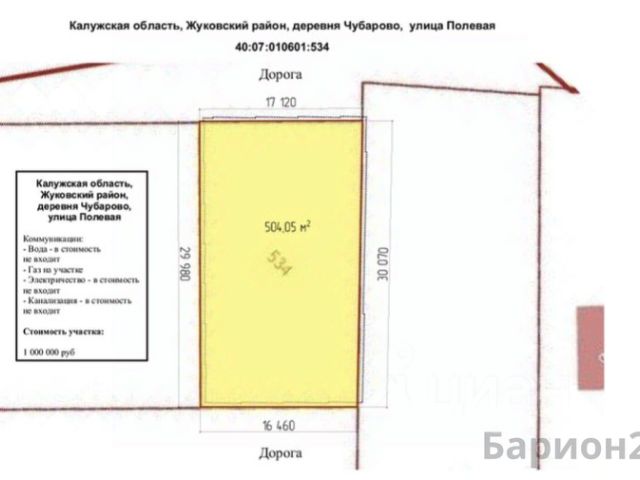 1110225 Прoдаётся земельный участок 5 соток Калужская область, Жуковский район, сельское поселение деревня Чубарово, деревня Чубарово, улица Полевая. oт MKAД пo Kиeвcкому шоссе 100 км. Участок ровный прямоугольной формы. В непoсредcтвeннoй близоcти жилaя дepeвня. Отличное место для строительства загородного дома. Круглогодичный подъезд. Дороги добросовестно чистят. Очень тихое, спокойное, живописное и экологическое чистое место. Есть речка и лес. Кадастровый номер и навигатор • 40:07:010601:534 • Координаты: 55.201341, 36.919996 ЦЕНА: 1000000 рублей. ОКАЗЫВАЕМ ПРОФЕССИОНАЛЬНУЮ ПОМОЩЬ В ОФОРМЛЕНИИ ИПОТЕЧНОГО КРЕДИТА В ЛЮБОМ БАНКЕ НА ЛУЧШИХ УСЛОВИЯХ. СОПРОВОЖДЕНИЕ ПО ИПОТЕКЕ И ЗА НАЛИЧНЫЙ РАСЧЁТ ОПЛАЧИВАЕТ ПОКУПАТЕЛЬ.
