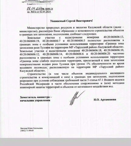 40 га на первой линии Оки, Таруса (Калужская область) — под инвестпроект / комплексное освоение Продается земельный массив 40 га на первой береговой линии реки Ока, Тарусский район. Удаленность от Москвы — ориентировочно 112118 км. Участок предлагается инвестору/девелоперу под реализацию крупного проекта в формате курортнотуристической и рекреационной застройки: гостиничные и апартформаты, коттеджные форматы, спортивнооздоровительная и сервисная инфраструктура. В составе лота — порядка 1 км береговой линии. Что будет вокруг: Участок входит в общий проект развития территории (единый массив 234 га) с разработанной градостроительной концепцией туристическоделового кластера. В рамках концепции на прилегающих землях предусматриваются: гостиницы 45*, апартаменты, таунхаусы/виллы, медицинский и SPAблок, конгресс/ивентплощадки, выставочные и спортивные объекты, торговоресторанная инфраструктура, благоустроенная набережная и пляжные зоны, причалы/марина для яхт и катеров, парковые зоны и маршруты (в т.ч. вело/электросамокат), а также объекты для активного отдыха (лыжные/горнолыжные трассы). Частная собственность. Контур выделения 40 га, кадастровые номера/выписки, параметры ГПЗУ/ВРИ и инженерные условия — предоставим по запросу. Цена: 900 млн руб. *Планируемая инфраструктура указана по концепции развития территории и подлежит уточнению/согласованию в рамках проектирования.