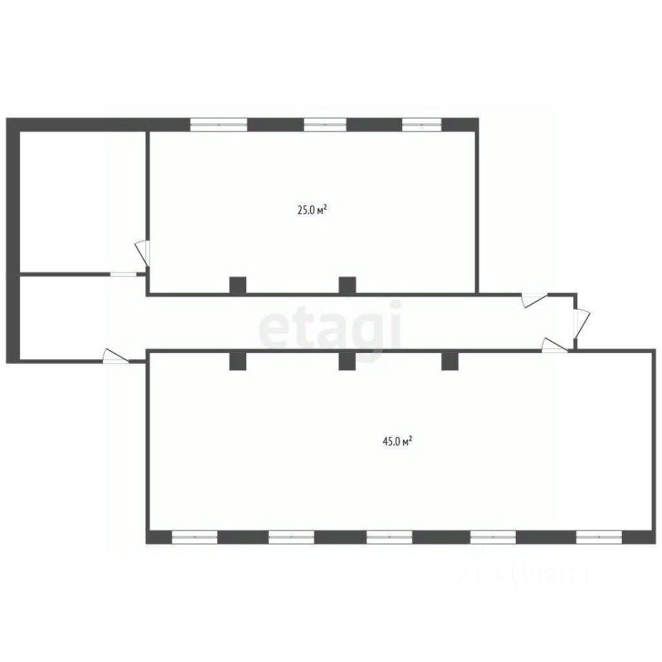 Пространство разделено на два кабинета — 25 и 45 кв. м, что позволяет гибко организовать рабочие зоны: разместить отдельные офисы, переговорную или совместить их под единый рабочий коллектив.