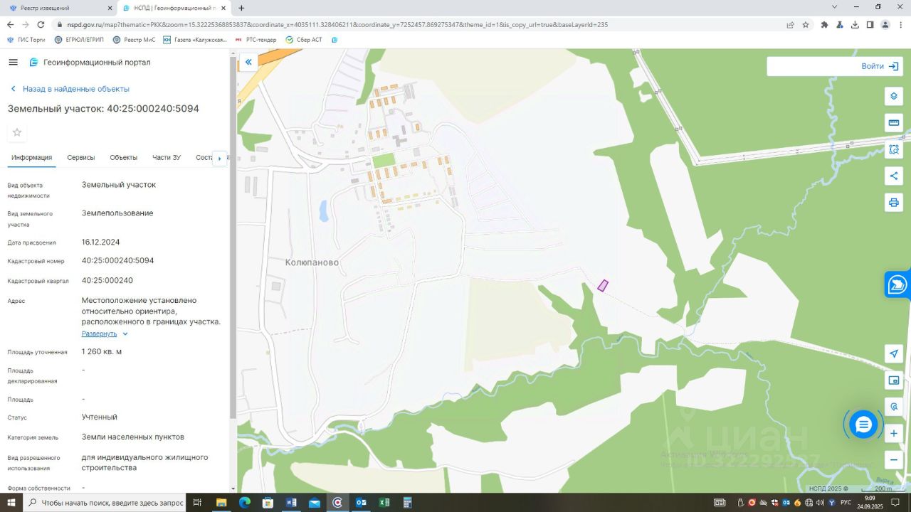 Земельный участок из категории земель населенных пунктов с кадастровым номером 40:25:000240:5094, вид разрешенного использования: для индивидуального жилищного строительства, площадью 1260 кв.м, местоположение: местоположение установлено относительно ориентира, расположенного в границах участка. Почтовый адрес ориентира: Российская Федерация, Калужская область, г.Калуга, д.Колюпаново.