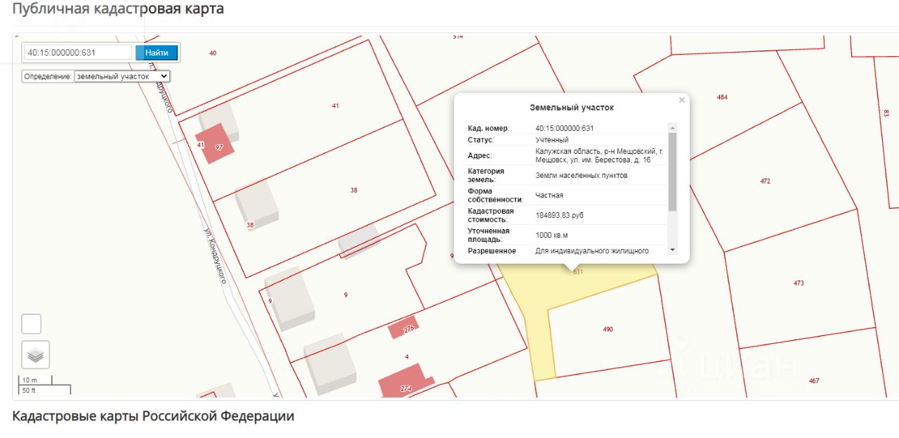 Лот3 - на право заключения договора аренды земельного участка из земель населенных пунктов, вид разрешенного использования для индивидуального жилищного строительства, с кадастровым номером: 40:15:000000:631, площадью 1000 кв.м, адрес в соответствии с ФИАС: Калужская область, р-н Мещовский, г. Мещовск, ул. им. Берестова, д.16
