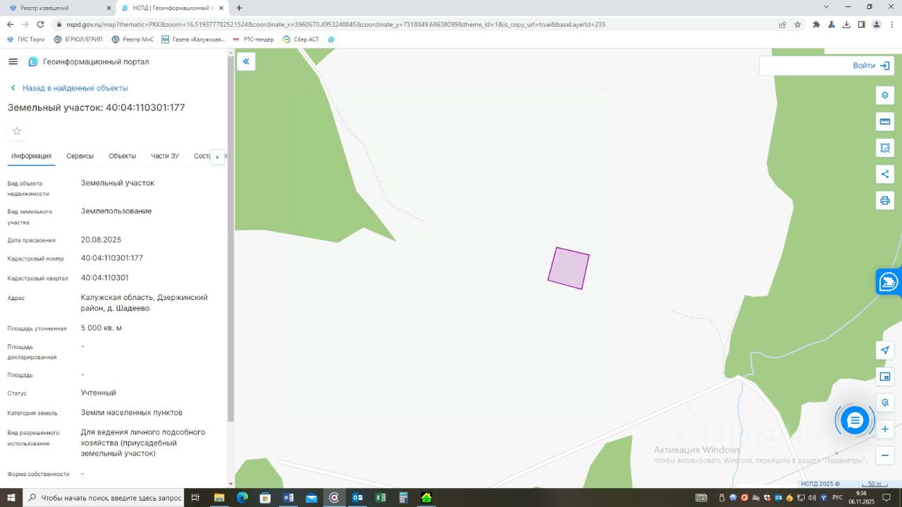 земельный участок из категории земель населенных пунктов с кадастровым номером 40:04:110301:177, вид разрешенного использования: для ведения личного подсобного хозяйства(приусадебный земельный участок), площадью 5000 кв.м, адрес в соответствии с ФИАС: Местоположение установлено относительно ориентира, расположенного в границах участка. Почтовый адрес ориентира: Калужская область, Дзержинский район, д. Шадеево.
