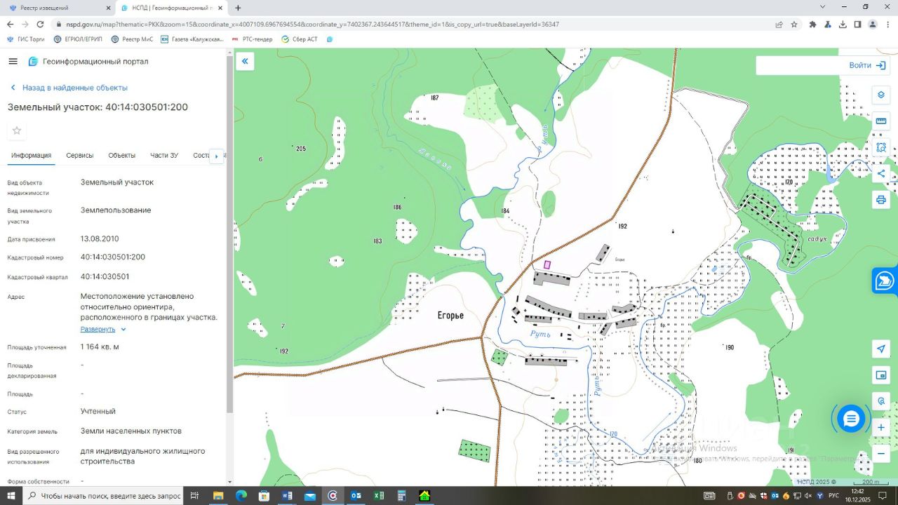 Земельный участок из категории земель населенных пунктов с кадастровым номером 40:14:030501:200, вид разрешенного использования: для индивидуального жилищного строительства, площадью 1164 кв.м, адрес в соответствии с ФИАС: Местоположение установлено относительно ориентира, расположенного в границах участка. Почтовый адрес ориентира: Калужская обл., р-н Медынский, с. Егорье, участок 89.