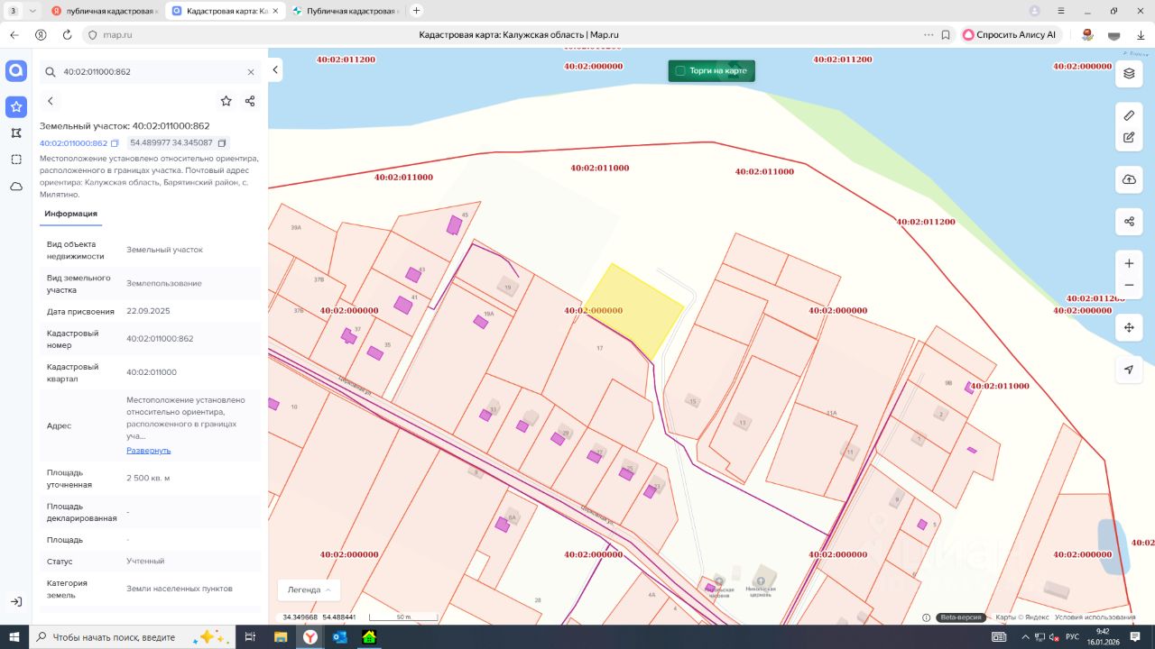 Лот 1- на право заключения договора аренды земельного участка из земель населенных пунктов, вид разрешенного использования для ведения личного подсобного хозяйства (приусадебный земельный участок), с кадастровым номером: 40:02:011000:862, площадью 2 500 +/-18 кв.м, местоположение: местоположение установлено относительно ориентира, расположенного в границах участка. Почтовый адрес ориентира: Калужская область, Барятинский район, с. Милятино