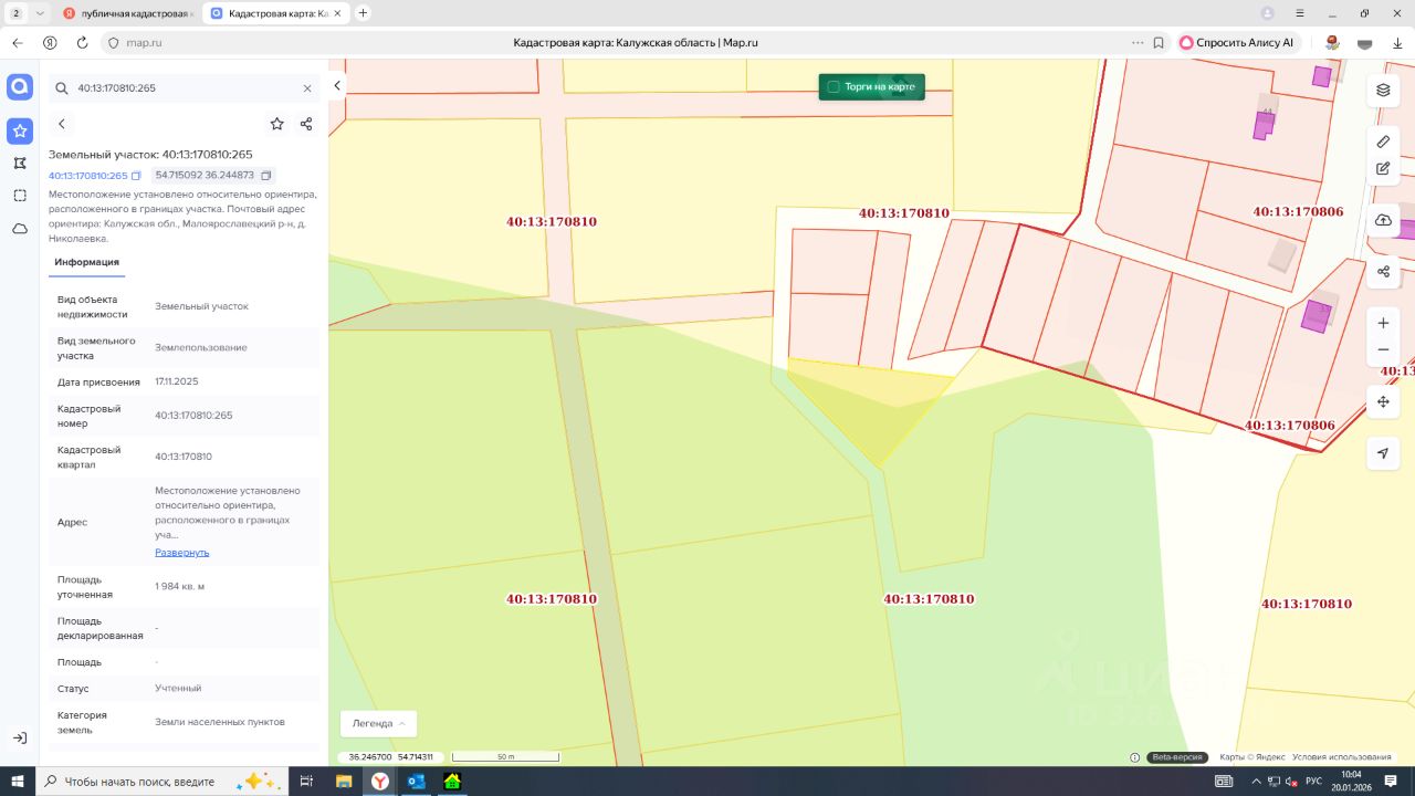 Лот1- на право заключения договора аренды земельного участка из категории земель населенных пунктов с кадастровым номером 40:13:170810:265, вид разрешенного использования для ведения личного подсобного хозяйства (приусадебный земельный участок), площадью 1984 +/-15.59 кв.м, местоположение: местоположение установлено относительно ориентира, расположенного в границах участка. Почтовый адрес ориентира: Калужская обл., Малоярославецкий р-н, д. Николаевка