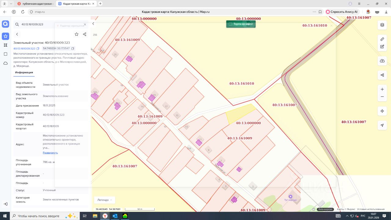 Лот1- на право заключения договора аренды земельного участка из категории земель населенных пунктов с кадастровым номером 40:13:161009:323, вид разрешенного использования для ведения личного подсобного хозяйства (приусадебный земельный участок), площадью 786 кв.м, адрес в соответствии с ФИАС: местоположение установлено относительно ориентира, расположенного в границах участка. Почтовый адрес ориентира: Калужская область, р-н Малоярославецкий, д. Мокрище