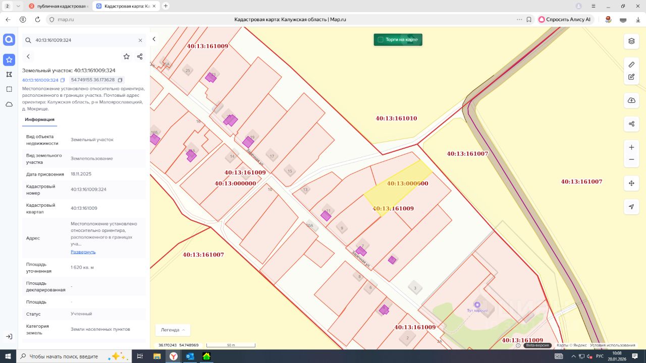 Лот2- на право заключения договора аренды земельного участка из категории земель населенных пунктов с кадастровым номером 40:13:161009:324, вид разрешенного использования для ведения личного подсобного хозяйства (приусадебный земельный участок), площадью 1620 кв.м, адрес в соответствии с ФИАС: местоположение установлено относительно ориентира, расположенного в границах участка. Почтовый адрес ориентира: Калужская область, р-н Малоярославецкий, д. Мокрище