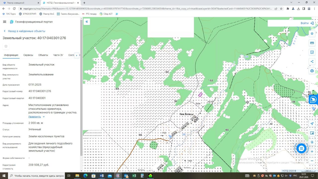 земельный участок из категории земель населенных пунктов с кадастровым номером 40:17:040301:276, вид разрешенного использования: для ведения личного подсобного хозяйства (приусадебный земельный участок), площадью 2000 кв.м, местоположение: Местоположение установлено относительно ориентира, расположенного в границах участка. Почтовый адрес ориентира: Калужская область, Перемышльский район, д. Нижние Вялицы.