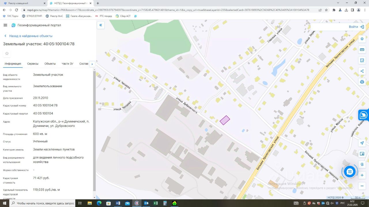 Земельный участок из категории земель населенных пунктов с кадастровым номером 40:05:100104:78, вид разрешенного использования: для ведения личного подсобного хозяйства, площадью 600 кв.м, адрес в соответствии с ФИАС: Местоположение установлено относительно ориентира, расположенного в границах участка. Почтовый адрес ориентира: Калужская область, р-н Думиничский, п.Думиничи, ул.Дуровского.