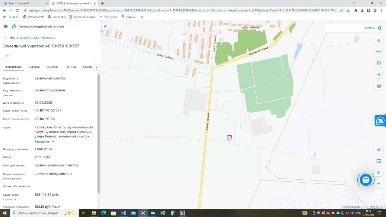 Земельный участок из категории земель населенных пунктов с кадастровым номером 40:19:170103:557, вид разрешенного использования: Бытовое обслуживание, площадью 1000 кв.м, местоположение: Калужская область, муниципальный округ Сухиничский, город Сухиничи, улица Ленина, земельный участок 132.