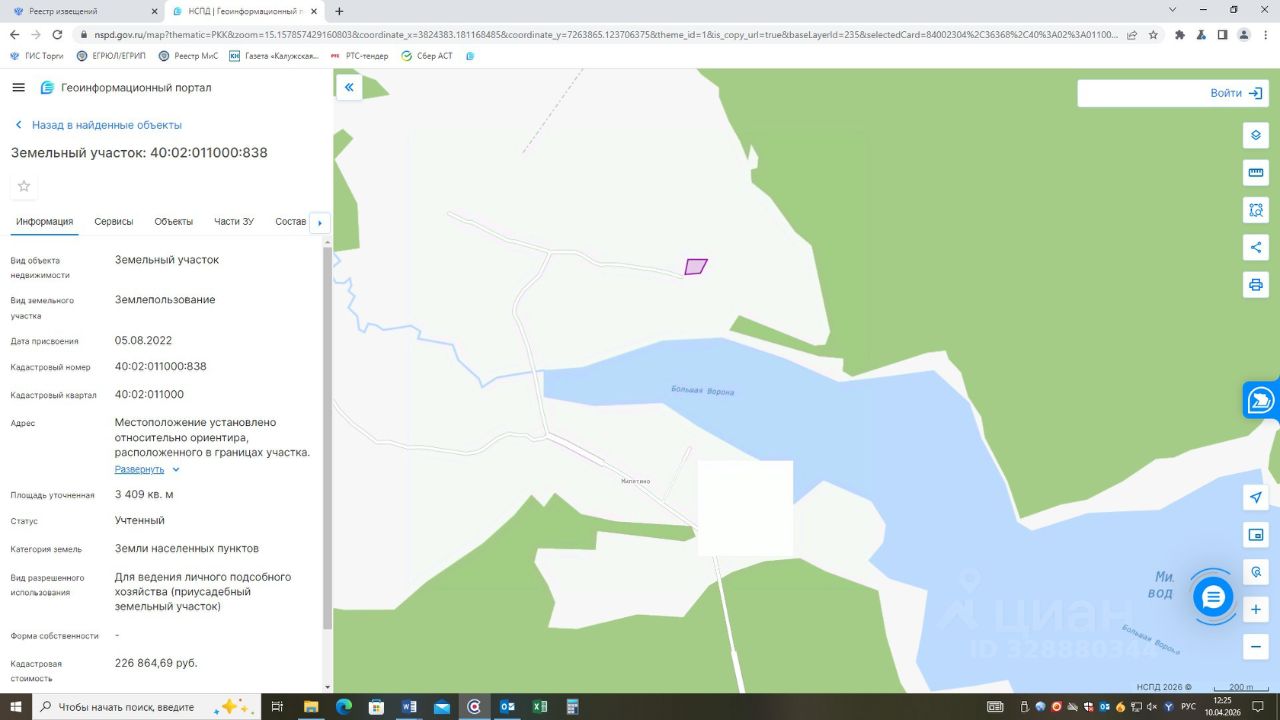 Земельный участок из категории земель населенных пунктов с кадастровым номером 40:02:011000:838, вид разрешенного использования: для ведения личного подсобного хозяйства (приусадебный земельный участок), площадью 3409 кв.м, местоположение: Местоположение установлено относительно ориентира, расположенного в границах участка. Почтовый адрес ориентира: Калужская область, Барятинский район, с.Милятино, ул.Заречная.