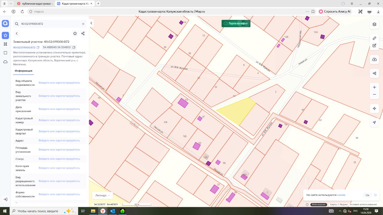 Лот 2- на право заключения договора аренды земельного участка из земель населенных пунктов, вид разрешенного использования для ведения личного подсобного хозяйства (приусадебный земельный участок), с кадастровым номером: 40:02:011000:872, площадью 1 565 +/-14 кв.м, местоположение: местоположение установлено относительно ориентира, расположенного в границах участка. Почтовый адрес ориентира: Калужская область, Барятинский р-н, с. Милятино.