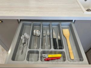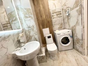 В квартире современная мебель, новая сантехника, натяжные потолки, стеклопакеты, хорошая шумоизоляция, фен, утюг, гладильная доска, сушилка для белья, стиральная машина. Есть все необходимое для проживания.