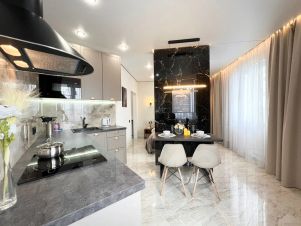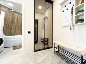 В квартире современная мебель, новая сантехника, натяжные потолки, стеклопакеты, хорошая шумоизоляция, фен, утюг, гладильная доска, сушилка для белья, стиральная машина. Есть все необходимое для проживания.