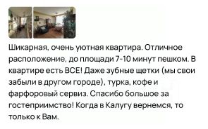 В историческом центре Калуги вас ждёт стильная и удобная квартира отельного типа. Кроме красивого интерьера всем гостям предлагается максимальный набор удобств - посудомоечная и стиральная машины, фен, утюг, гладильная доска, высокоскоростной Wi-Fi, телевизор с подпиской на стриминговые сервисы кино и музыки, Bluetooth-колонка, тихий и очень мощный вентилятор-люстра над кроватью. Ничего не нужно привозить с собой - вас ждут мягкие полотенца, зубной набор, мыло в индивидуальной упаковке, средства для посудомойки и стиральной машины.