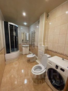 На кухне - плитка, на стенах обои, потолки - натяжные, санузлы полностью в плитке.