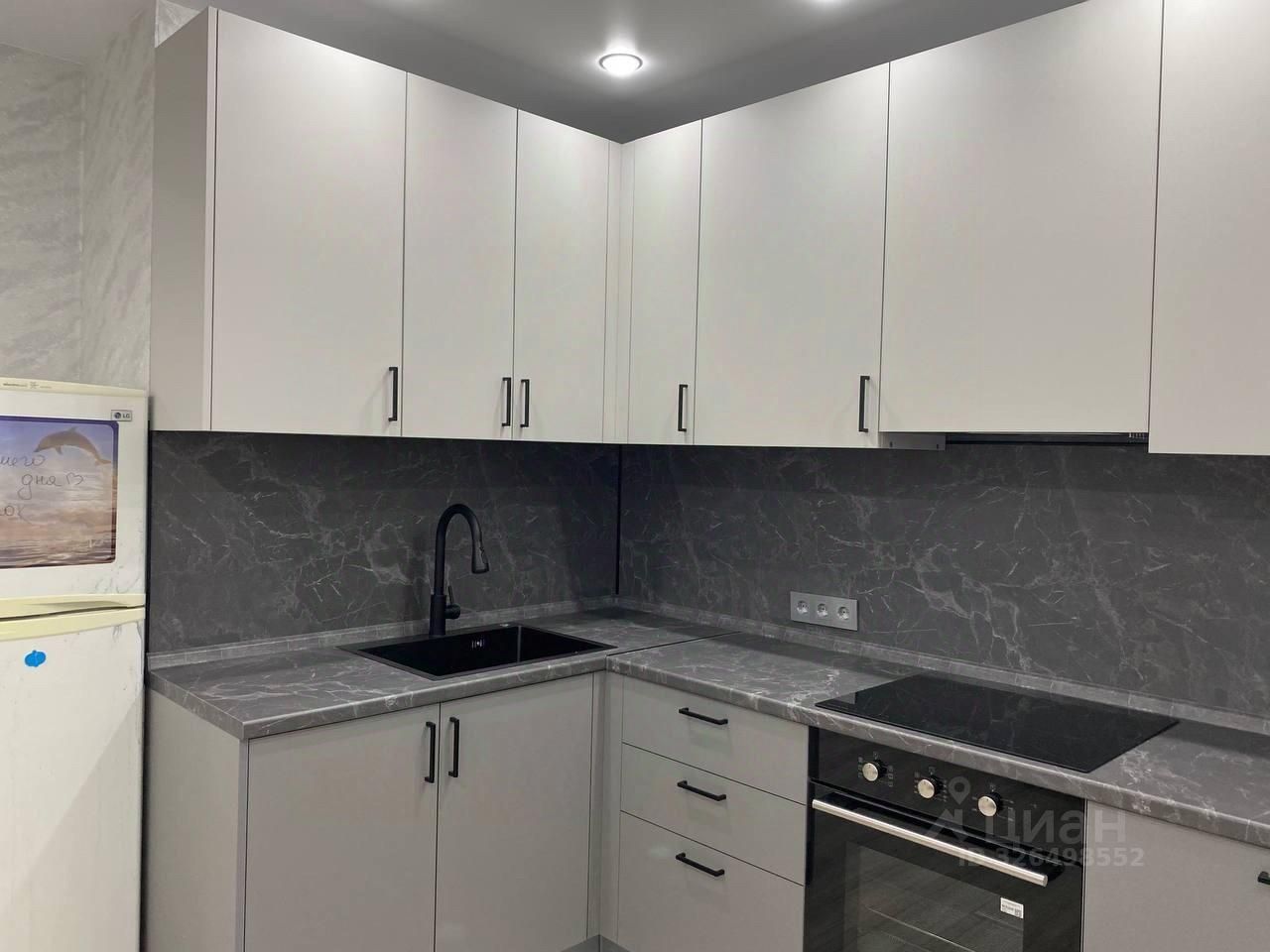 Кухня: индукционная плита, духовой шкаф, холодильник, микроволновка, чайник, обеденный стол + 4 стула.