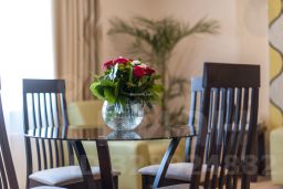 В прихожей и гостиной комнате располагаются гардероб, вешалка для верхней одежды, зеркало в полный рост, тумбочка для багажа, телевизор с экраном 32 дюйма, обеденный стол с пятью стульями, мягкий кожаный двухместный диван со спальным местом и двумя кожаными креслами, два журнальных столика к дивану, индивидуальный цифровой сейф, мини-бар, чайник, набор чайной посуды.