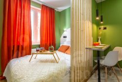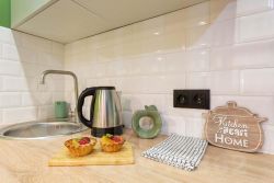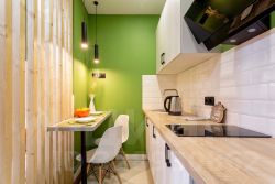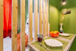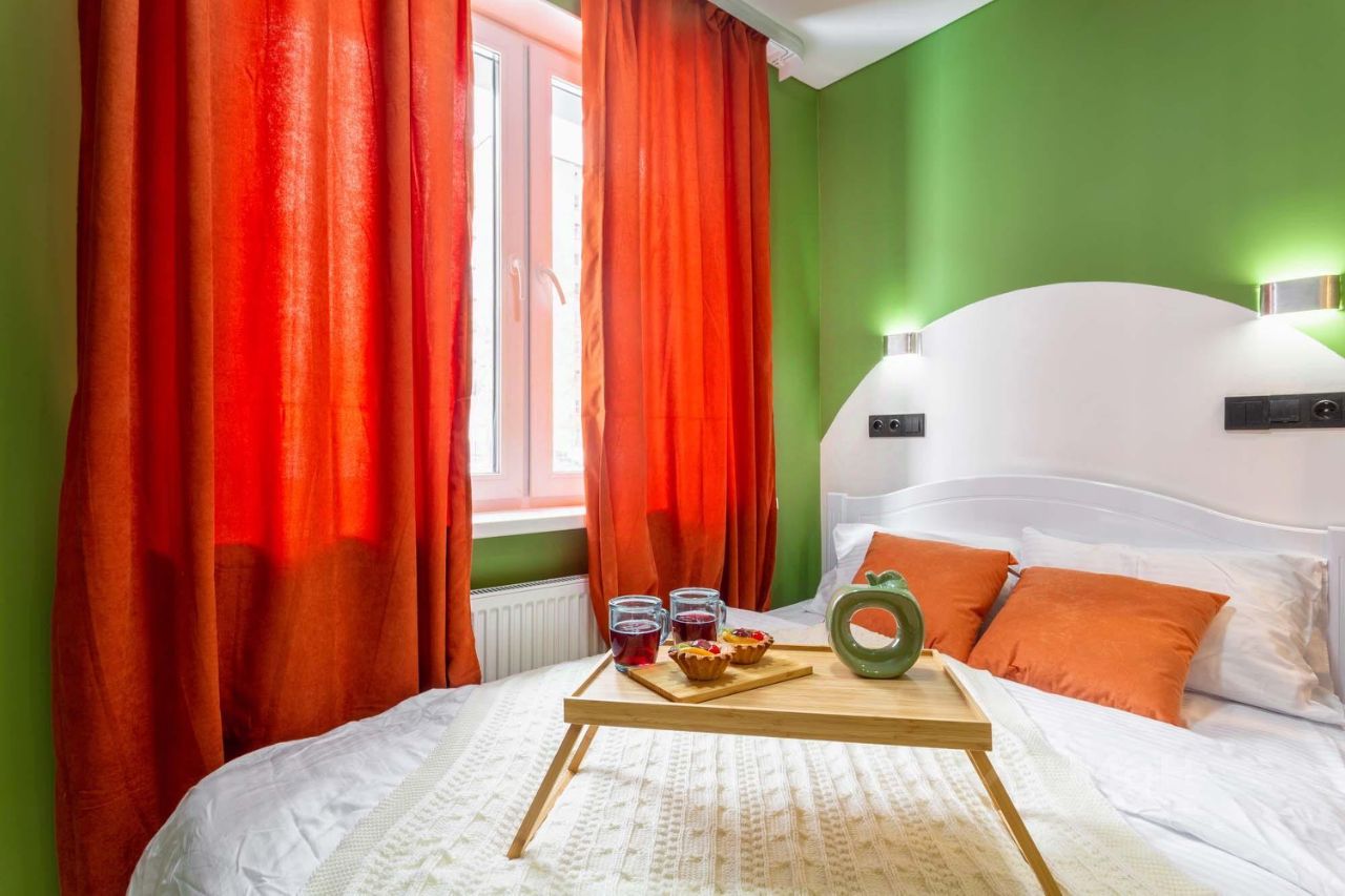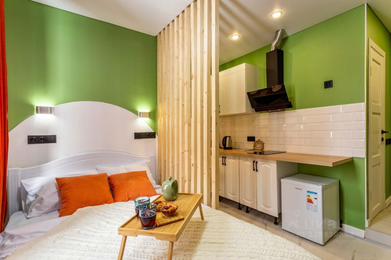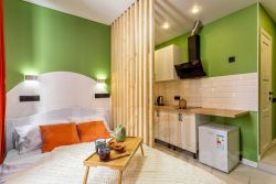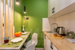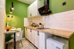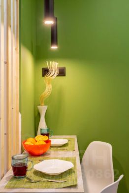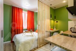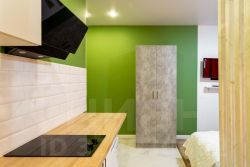 Яблоко - яркая и уютная квартира-студия в Обнинске на улице Курчатова. Основной цвет стен - ярко-зеленый, что придает помещению свежий и живой вид.