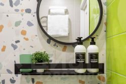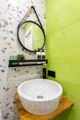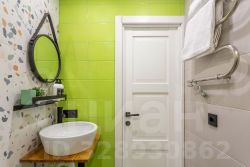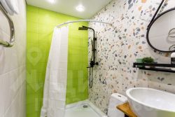 Совмещенный санузел оборудован душевой кабиной, унитазом, раковиной с большим зеркалом. Все сантехнические элементы и мебель подобраны в тон зеленым стенам, создавая гармоничный и стильный образ.