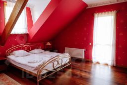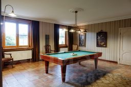 В доме на первом этаже расположены — кухня, бильярдный зал, гостиная с дровяным камином, ванная комната и одна спальня со своей ванной комнатой.