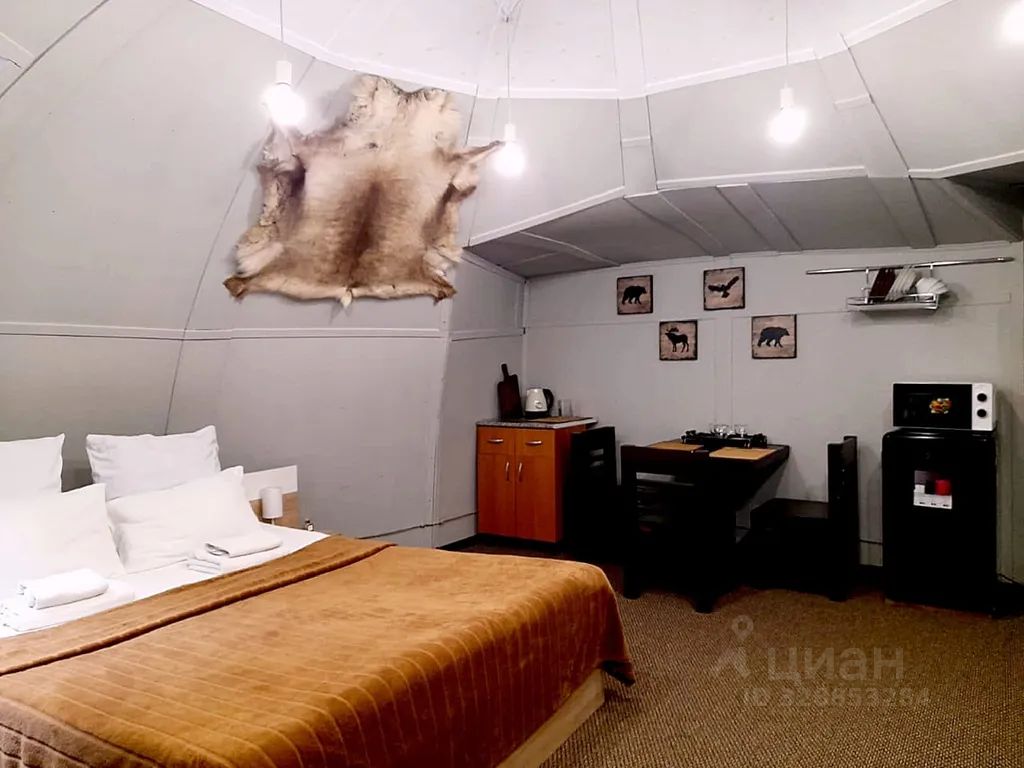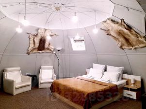 Дом-купол рассчитан на комфортное размещение 2 человек. В нем — просторная спальня с совмещенной гостиной комнатой и небольшой обеденной зоной, санузел. В доме есть кондиционер (в летний период).