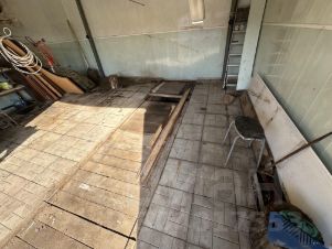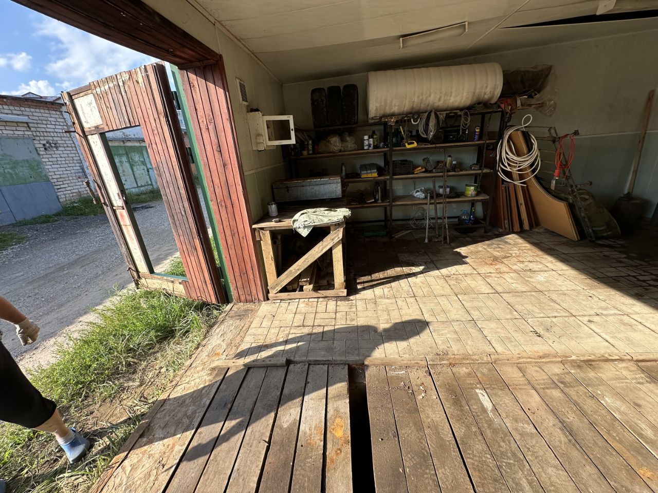 Есть смотровая яма на всю длину гаража. Установлена стационарная металлическая лестница для удобного спуска в смотровую яму и подвал.