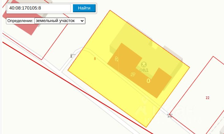Земельный участок площадью 2000 кв. м, кадастровый номер 40:08:170105:8 (реестровый номер федерального имущества П11420000970), по адресу: Местоположение установлено относительно ориентира, расположенного в границах участка. Почтовый адрес ориентира: Калужская область, р-н Износковский, с. Износки, ул. Ленина, д. 5, с расположенным на нем объектом недвижимого имущества — административное здание площадью 660,4 кв. м с кадастровым номером 40:08:170105:57 (реестровый номер федерального имущества П12420001478).