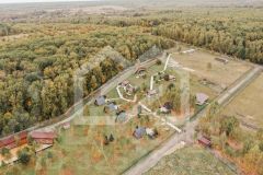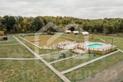 -на территории летний бассейн, расположенный на двухуровневом подиуме, зарыбленный пруд, детская площадка, 4 летние беседки, 1 большая беседка с летней кухней, 2 административных здания для проживания рабочего персонала, склад;