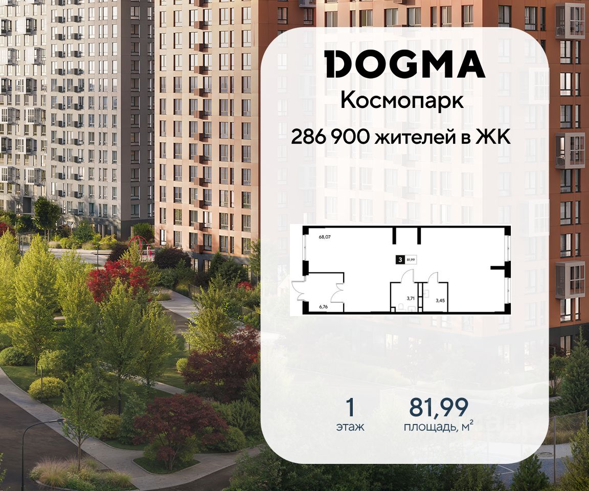 В реализации — коммерческое помещение свободного назначения в литере 3.2 общей площадью 81.99 кв.м. на 1 этаже от застройщика DOGMA в жилом квартале "Космопарк", который расположен в г. Калуга.