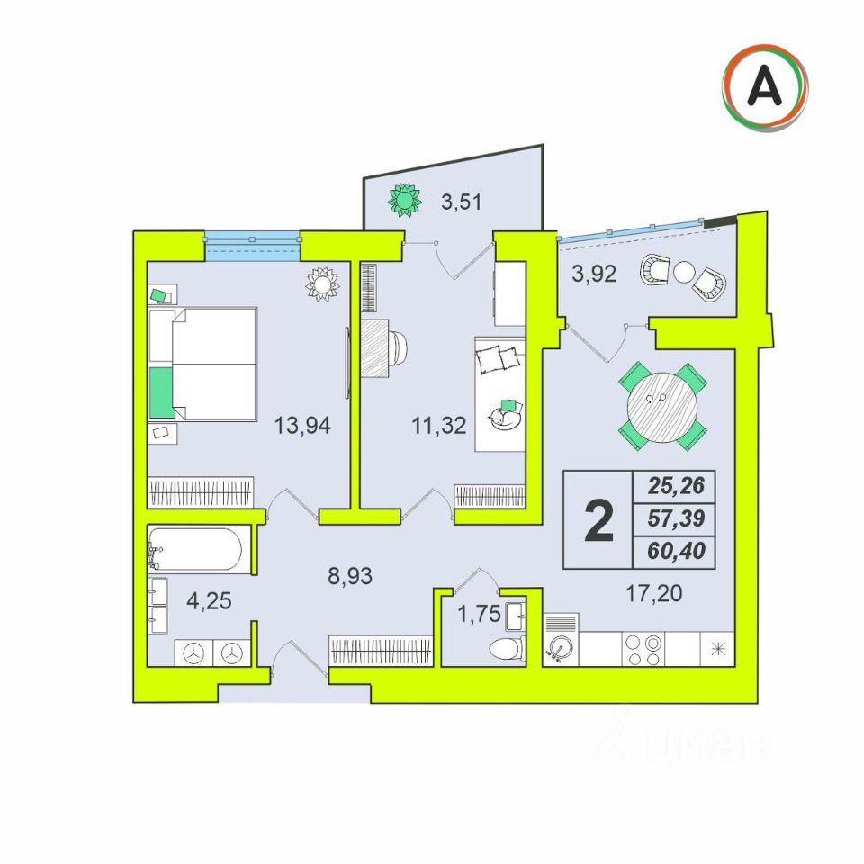 Общая площадь60,4 м²