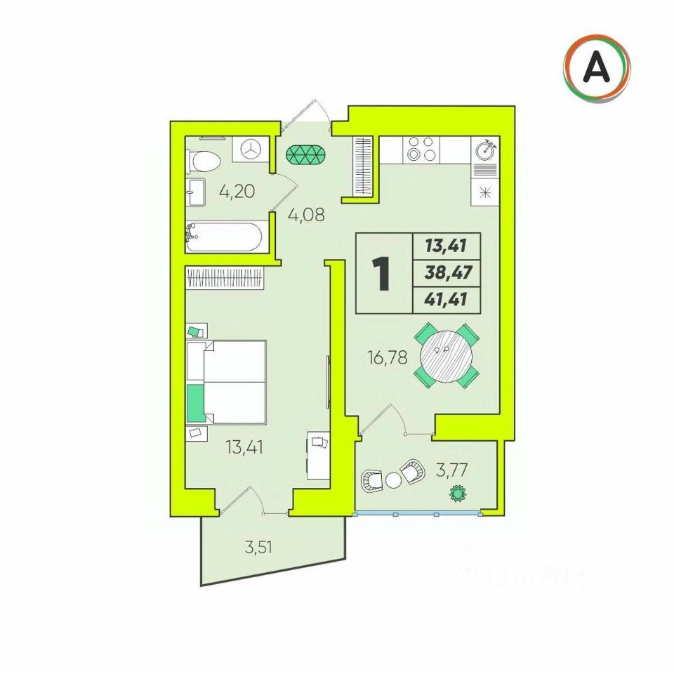 Общая площадь41,41 м²