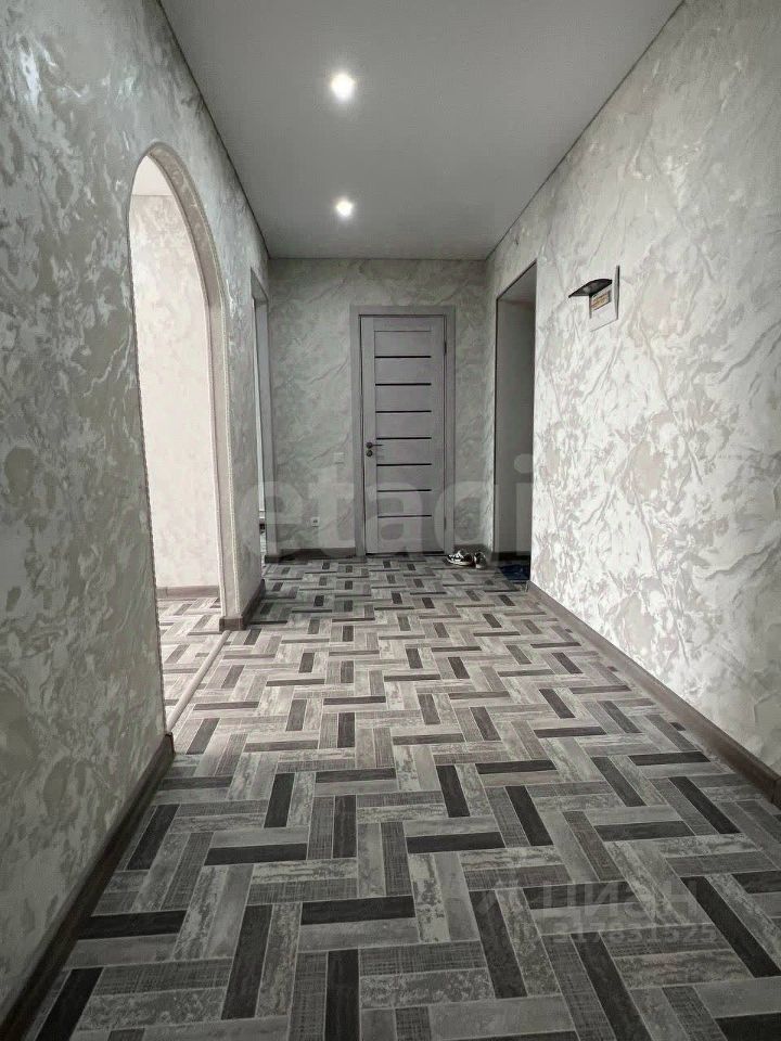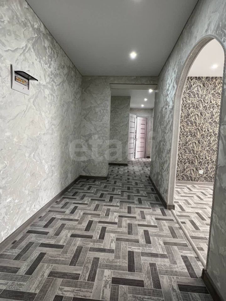 В квартиpе сделан peмонт: поклеены обои в пастельных тонах, натянуты матовые потолки с точечными светильниками, на полу линолеум и кафель.