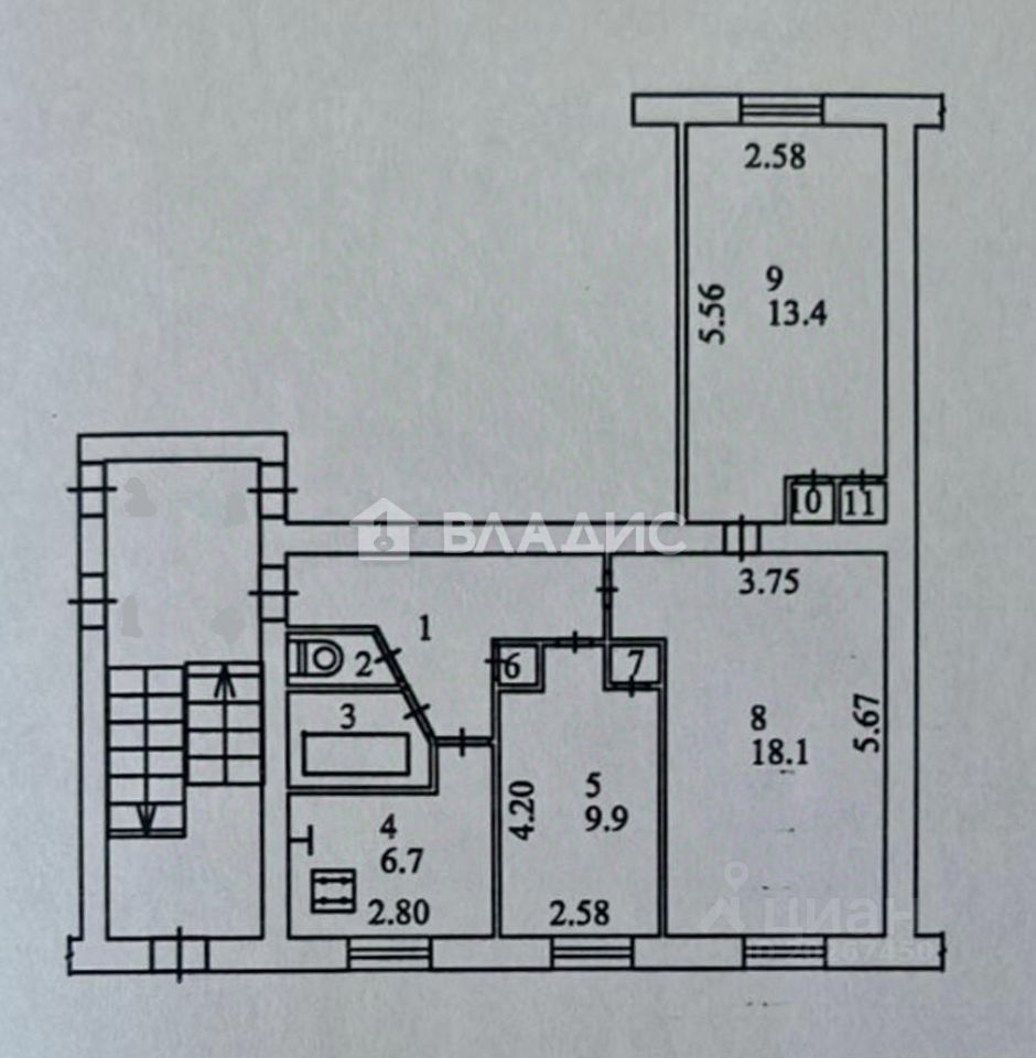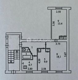 Общая площадь 60,4 кв.м. Кухня 6,7 кв.м. Гостинная 18,1 кв.м. 2 изолированные спальни 13,4 и 9,9 кв.м. Санузел раздельный. Прихожая 7,8 кв.м.