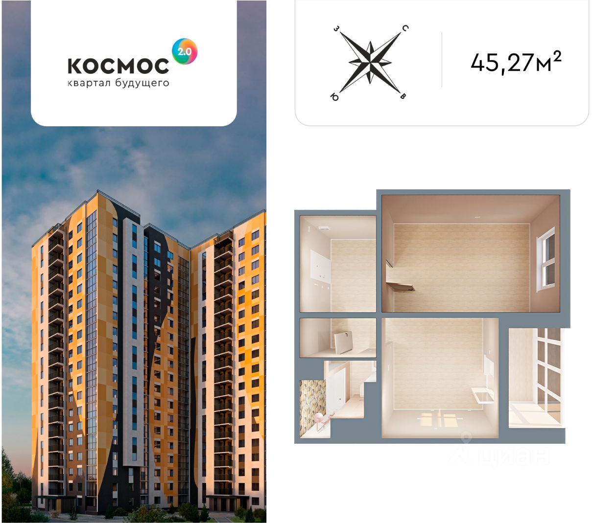 Продается1-комнатная квартира, 43,1 м²в ЖК Космос 2.0, по адресу: г. Обнинск, район Заовражье, Табулевича 1 п.1.