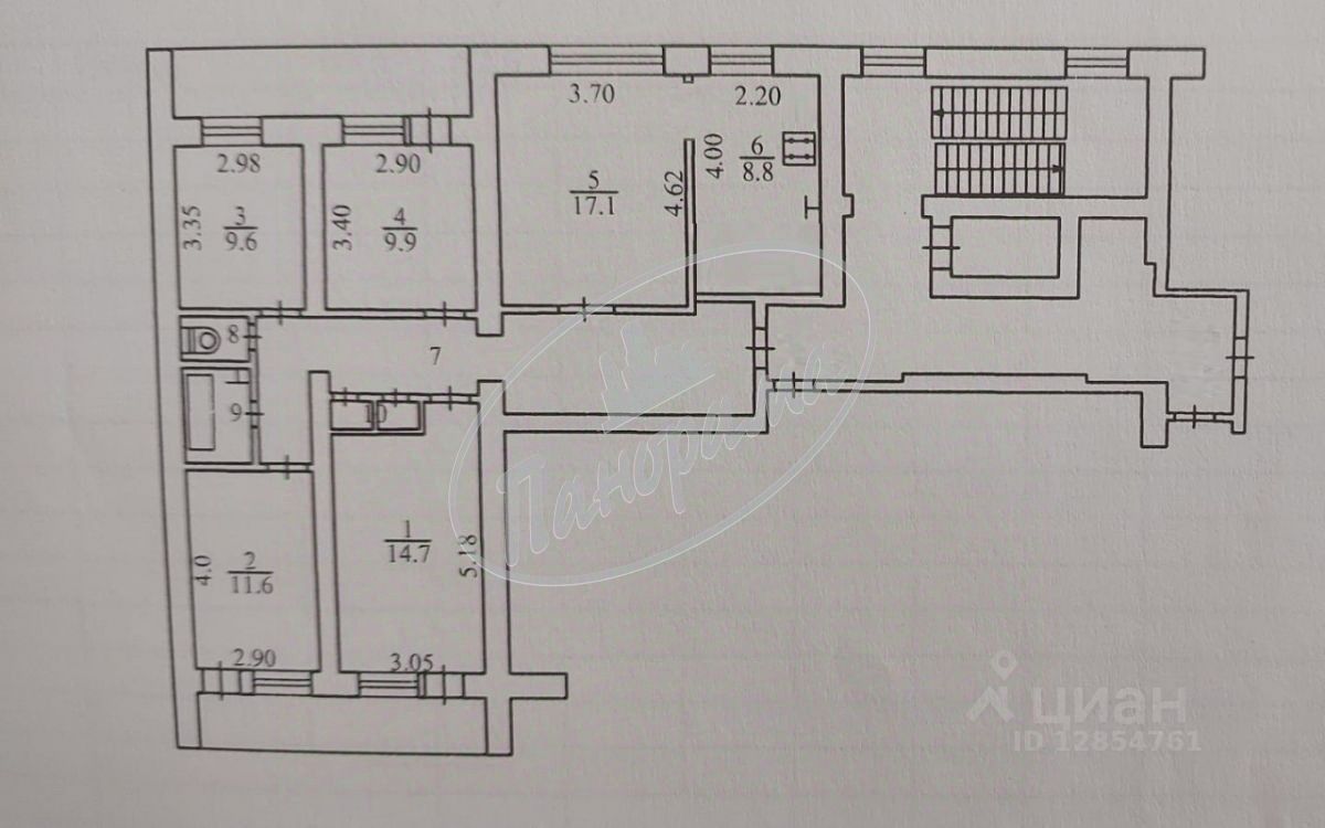 Продаётся просторная 5-комнатная квартира площадью 90.6 квадратных метров на седьмом этаже девятиэтажного кирпичного дома, расположенного в районе Правобережье города Калуги по адресу улица Генерала Попова, дом 22.