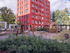 Благоустроенная территория двора, парковочные места, места для отдыха и занятий спортом, парковые зоны.
