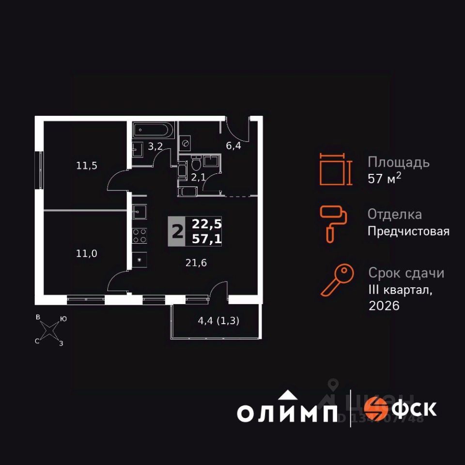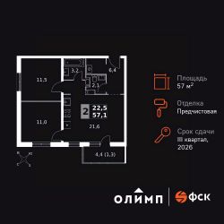 Продаётся 2-к квартира номер 125 общей площадью 57.1 кв.м. на 16-м этаже 24 этажного дома. Отделка Whitebox. Цена с учётом скидки!