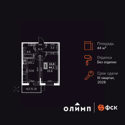Продаётся 1-к квартира номер 4 общей площадью 44.4 кв.м. на 1-м этаже 22 этажного здания. Без отделки. Цена с учётом скидки.