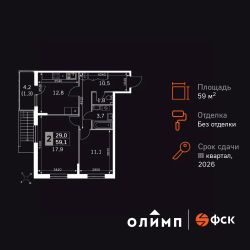 Продаётся 2-к квартира номер 5 общей площадью 59.1 кв.м. на 1-м этаже 22 этажного дома. Без отделки. Цена с учётом скидки!