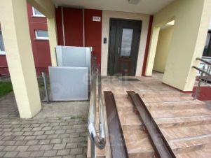 Огороженная территория двор с детской площадкой. Установлны подъемники для малоподвижных групп населения