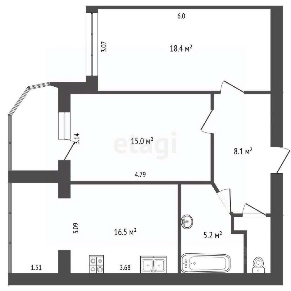 Комнаты изолированные:- 18,4 кв.м.